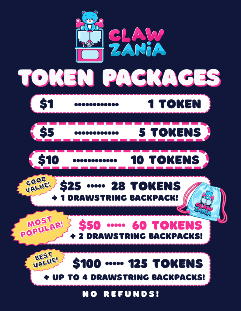 Most claw machines with small plush prizes require 1-2 tokens per play. Our “cut-the-rope” machines with XL plushies are 2 tokens per play, and the photo booth is 6 tokens. Occasionally, we feature special edition collectibles, which may require a varying number of tokens. Always check the screen on the machines if you are unsure!
